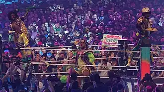 At Extreme Rules on April 26, The New Day defeated Kidd and Cesaro to capture the WWE Tag Team Championship; Big E and Kingston were the participants in the match, but WWE also recognized Woods as champion under the Freebird Rule, in which any two members of a stable can compete for the titles.[41] At Payback on May 17, Big E and Kingston defeated Kidd and Cesaro in a two-out-of-three falls match to retain the WWE Tag Team Championship after Woods pinned Cesaro, despite not being a legal participant in the match.[42] At Elimination Chamber on May 31, all three New Day members competed in the first-ever tag team Elimination Chamber match for the WWE Tag Team Championship, where they lastly eliminated The Prime Time Players (Darren Young and Titus O'Neil) to retain their titles.[43] However, at Money in the Bank on June 14, Big E and Woods lost the championships to The Prime Time Players. Big E and Kingston then lost their rematch at Battleground on July 19.[44] The New Day would regain the championship after they defeated Los Matadores (Diego and Fernando), The Lucha Dragons and The Prime Time Players in a fatal four-way match at SummerSlam on August 23. Despite being heels, the trio received heavy positive reactions from audiences who began to chant "New Day rocks!". The following night on Raw, they were attacked by the returning Dudley Boyz, with Woods being put through a table.[45] This started a feud between the two teams, setting up a title match at Night of Champions on September 20, where Big E and Kingston lost by disqualification, though, by rule, they retained their titles. They lost via disqualification to retain their championships again in a rematch against The Dudley Boyz at WWE Live from Madison Square Garden,[46] but defeated them via pinfall at Hell in a Cell on October 25 to retain the titles, thus ending their feud.[47] The New Day led their own team at Survivor Series including Sheamus and King Barrett, but left the match prematurely to tend to Big E after his elimination, leading to their team's eventual loss.[48] At TLC: Tables, Ladders & Chairs on December 13, they retained the WWE Tag Team Championship against The Lucha Dragons and The Usos (Jimmy and Jey Uso) in a triple threat ladder match.[49] The New Day then successfully defended their titles against The Lucha Dragons on the special December 22 episode of Super SmackDown Live![50] and against The Usos on January 24, 2016, at the Royal Rumble event.[51]