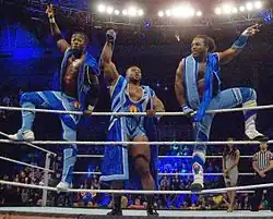 The early months of the stable as stereotypical black gospel babyface characters were marked by largely negative reactions from fans and critics alike, but after transitioning their characters into heels fanatically obsessed with the nostalgia-style "power of positivity" in April 2015, they began to receive acclaim for their entertainment value, as well as for their in-ring performances.[1][2][3][4] In 2015, the trio were collectively named "WWE Wrestler of the Year" by Rolling Stone, while also being recognized as the "Best Gimmick" of the year by the Wrestling Observer Newsletter.[5][6] Additionally, they became the first trio to win the Pro Wrestling Illustrated award for "Tag Team of the Year", doing so in 2015 and 2016 (the first two wins in a row in this category for two decades). Their new-found popularity resulted in the trio reverting to babyfaces in early 2016, which they remained as until December 2024, when Kingston and Woods reverted back to being heels after Big E’s firing from the group. The three, who are close friends in real life, also appear or work together outside of wrestling, notably writing the 2016 book The Book of Booty: Shake It. Love It. Never Be It, and hosting a weekly podcast, Feel the Power (named after one of their catchphrases), since 2019. In 2021, The New Day topped WWE's list of the "50 Greatest Tag Teams" in the promotion's history.[7]