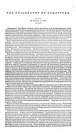 "The Philosophy of Furniture" is an essay written by American author Edgar Allan Poe and published in 1840. It presents Poe's theories on interior decorating.