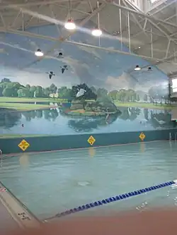 Promoted by the citizens of Richmond, The Plunge was created through a bond issue in 1926.[3] At that time, it was a "state of the art" two-story building with an indoor warm water swimming pool double the size of an Olympic pool, a fountain, observation balconies, and an open truss ceiling reminiscent of the Sutro Baths in San Francisco. Richmond's population was about 20,000 then, grew to over 200,000 during the "war years" and is now about 110,000.