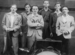 In 1947 Ray Price joined the then seven-piece band as their business manager / musical director,[7] and played guitar and banjo in the rhythm section.[2] That year the band made headlines when they refused to play at Sydney's Air Force House due to a "color ban" put in place by the venue management.[8][9] The band members were all ex-servicemen and spoke out against racial prejudice and continued to play elsewhere.[10] Their repertoire included tradition African-American music from the 1920s.[11] In early 1948 the ensemble were the first artists to perform jazz at Sydney Conservatorium of Music.[12] After an interstate tour where the band were accused of communist sympathies, the band broke up in 1948.[7] Ken Flannery was the only remaining original founding member at this time, and he reformed the group the following year without Price.[4]