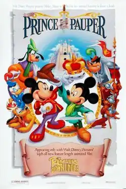 The Prince and the Pauper is a 1990 American animated comedy action adventure short film produced by Walt Disney Feature Animation and directed by George Scribner. Featuring the voice of Wayne Allwine as Mickey Mouse, it is based on the 1881 novel of the same name by Mark Twain. It was Disney's final use of the traditional ink-and-paint and camera process for a theatrical product,[1] before the CAPS digital-ink-and-paint process rendered the traditional techniques and equipment obsolete.[2] It's also the final Mickey Mouse short to use the APT process. Some objects, such as the carriage, were created on computers before being printed out on paper and photocopied onto animation cels.[3] The animation was given a watercolor look and based on Disney's style from the late 30s, influenced by Fred Moore.[4]