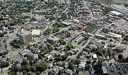 Hotel in downtown Glens Falls in 2008, on right side of City Park in upper center of photo