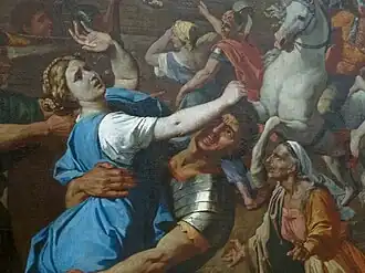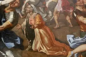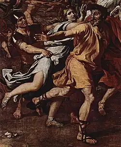 5. ^ In the right of the foreground, the Roman warrior's violently twisted pose and defined musculature are emphasised by his form-fitting lorica—perhaps anachronistic in its golden colouring, but balancing with the blue of the Sabines' rumpled garments.[13] He brandishes an upraised blade, resembling a rondel dagger or stiletto.