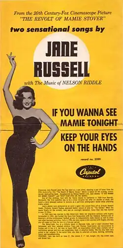 Hollywood gossip columnist Hedda Hopper wrote in her May 17, 1956 column: "Since the success of 'Mamie Stover,' Buddy Adler has signed Raoul Walsh to three more pictures at 20th Century Fox, and is trying to buy one of Jane Russell's commitments from Howard Hughes so he can star Jane in a romantic musical." Raoul Walsh's next three pictures for 20th Century Fox were The Sheriff of Fractured Jaw (1958); A Private's Affair (1959) and Esther and the King (1960). He made one more film for Fox, Marines, Let's Go released in 1961. Apparently Adler wasn't able to secure a deal with Hughes for Russell's services. Jane wouldn't appear in a Fox film until 1964's Fate Is the Hunter, and her role was a cameo appearing as herself.