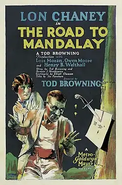 The Road to Mandalay is a 1926 American silent drama film directed by Tod Browning and starring Lon Chaney, Owen Moore, and Lois Moran. It was written by Elliott Clawson (with Joseph Farmham doing the intertitles), based on a story idea by Tod Browning and Herman Mankiewicz. The script's original shooting title was Singapore. The film took 28 days to complete at a cost of $209,000. The worldwide box office gross was $724,000. Some stills exist showing Chaney's makeup as Singapore Joe.[1][2]
