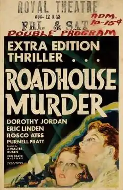The Roadhouse Murder is a 1932 American pre-Code thriller directed by J. Walter Ruben and written by J. Walter Ruben and Gene Fowler and starring Dorothy Jordan, Eric Linden, Purnell Pratt, Roscoe Ates and David Landau. It was released on April 28, 1932, by RKO Pictures.[1][2][3]