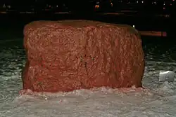 The stone was again unearthed, and a member of the senior class carved "Class '73" into the large flat face of the stone. The initial carving was misspelled, and the corrections to the carving make the text off-center. The stone was officially dedicated on May 30, 1873.[4]