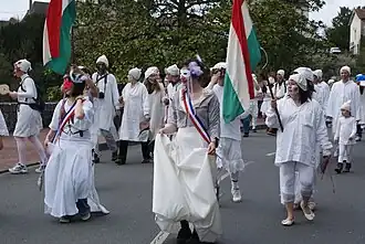 On a Sunday in April, between 200 and 300 Soufflaculs gather at 2 pm in front of the village hall.[39] They're dressed in long white nightgowns, white cotton nightcaps, clogs (often red), their faces covered with false noses,[22] masks or flour, or even smeared with black smoke.[11][12][17][32][39] They march down the street, one behind the other, carrying a bellows.[11][12][39] Each participant places the bellows on the buttocks of the person in front of them and sings in Occitan: "E bufa s'i al cual".[11][12][16] Some participants form caterpillars by sewing their nightgowns together.[53]