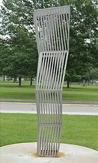 The South Tower is an abstract, frosted stainless steel aluminum rectangular sculpture.[4] Measuring 10 ft x 3 ft x 2 ft, the structure is vertically-louvered and is depicted as coming apart at the top.[3] The grate-like design of each section is carried through the sculpture creating a leaning, S-shaped structure.[5] Each section is composed of 11 straight bars of aluminum. Four bolts secure the artwork to the circular concrete base.[6] It is signed "Don Gummer 2008" on the front of the artwork, at the top of the bottom element.