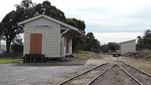 The Summit station opened on 3 March 1881, when the Queensland Railway's Southern line was extended from Warwick to Stanthorpe.[4] It was served by freight trains conveying apples for Golden Circle until 2007.[5]