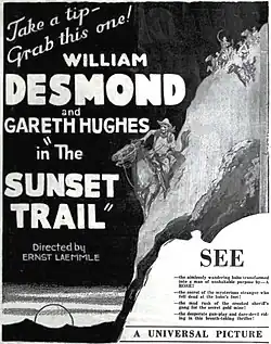 The Sunset Trail is a 1924 American silent Western film directed by Ernst Laemmle and starring William Desmond, Gareth Hughes, and Lucille Hutton.[1][2]