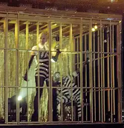 Stefani performing "The Sweet Escape" inside a gold cage on The Sweet Escape Tour