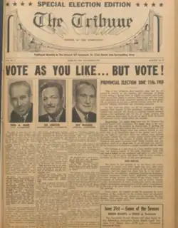 The Tecumseh Tribune began in 1959 under the ownership of Lucien “Kit” Lacasse and Henry F. Hayes. Both the Lacasse and Hayes families were long time members of the community. Dr. Gustave Lacasse was mayor of Tecumseh from 1928 - 1929, Hector Lacasse also wrote editorials for the paper, “Armchair Critic” by “Hec-que-tor” and was mayor from 1966 - 1970 as well as Deputy Reeve to George Hayes. Kit's brother Joe also joined the paper in 1979, and family member Paul Lacasse wrote front-page articles in the 1990s. Jean-Marc Lacasse would write multi-page articles on his tumultuous canoe trips in Manitoba and Northern Ontario during the 1980s, complete with great photos and drawings.[2]