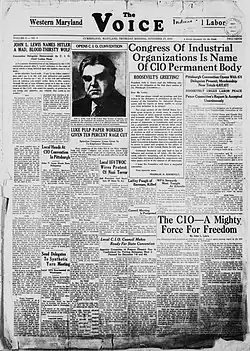 The Voice of Labor was a biweekly newspaper covering issues related to the labor movement and was published from December 1, 1938, to July 30, 1942, in Cumberland, Allegany County, Maryland, after which point it became the Western Maryland edition of The CIO News.[1] It was originally founded in 1937 by labor activists James Blackwell and Clyde D. Lucas as The Voice during a time of great upheaval in the American labor movement. The paper was published by the Western Maryland Industrial Union Council of the Congress of Industrial Organizations (CIO). Blackwell was a veteran labor organizer and left-wing agitator who had previously led the People's Unemployment League in Baltimore and the city's United Auto Workers. He acted as the paper's inaugural managing editor until June 1941.[2] Lucas was a native of western Maryland and leader of the textile workers at the massive Celanese plant in Cumberland.