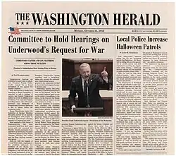 The fictional The Washington Herald, with the main headline being the fictional U.S. President Frank Underwood asking Senate to approve him declaring a war