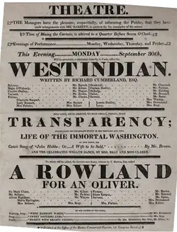 The play was a success running for 28 performances in its original run[3] and was Cumberland's most popular comic work.[4] One of the Drury Lane staff observed "the success which has attended the performances of The West Indian has exceeded that of any comedy within the memory of the oldest man living".[5] The original Drury Lane cast included Francis Aickin as Stockwell, Thomas King as Belcour, John Hayman Packer as Captain Dudley, Samuel Cautherley as Charles Dudley, John Moody as Major O'Flaherty, James Aickin as Stukely, Robert Baddeley as Fulmer, William Parsons as Varland, Elizabeth Hopkins as Lady Rusport, Frances Abington as Charlotte Rusport, Sophia Baddeley as Louisa and Mary Bradshaw as Stockwell's Housekeeper.