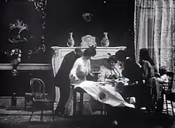 The scene resets, in an apparent retake,[3] and this time, the dog jumps to the floor and exits the scene. Mr. Dam sits down, and starts to serve soup to the family. Seeing that Jimmy is smoking at the table, Father jumps up and shouts at him to put the cigarette out. Jimmy pinches the cigarette to extinguish it, and reaches to place it on the mantelpiece, but Mr. Dam shouts again and Jimmy theatrically throws the cigarette on the floor.