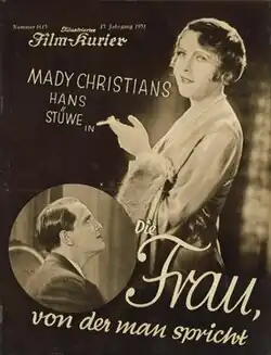 The Woman They Talk About (German: Die Frau von der man spricht) is a 1931 German drama film directed by Victor Janson and starring Mady Christians, Hans Stüwe and Lilian Ellis.[1] The film's art direction was by Botho Hoefer and Bernhard Schwidewski. It is based on the play Daniel by Louis Verneuil.