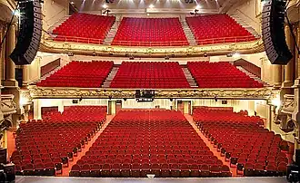 Théâtre Mogador (French pronunciation: [teɑtʁ mɔɡadɔʁ]), founded in 1913 with design by Bertie Crewe, is a Parisian music hall theatre located at 25, Rue de Mogador in the 9th arrondissement. It seats 1,600 people on three tiers (orchestra: 787 seats, boxes: 432 seats, balconies: 381 seats).