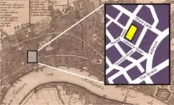 The King's Company never recovered financially from the loss of the old Theatre Royal Bridges Street. The cost of constructing the new theatre, replacing their costumes and scenery lost in the fire and competitive pressure from the rival Duke's Company contributed to its decline. Eventually, in 1682, the King's Company merged with the Duke's.[34] The 1674 Theatre Royal building contained a warren of rooms, including storage space and dressing rooms used by the management and performers, nearly seventy people in total, as well as some fifty technical staff members.[35] Additionally three rooms were provided for scripts, including a library for their storage, a separate room for copying actors' parts and a special library for the theatre's account books, ledger books and music scores. This jumble of rooms often made communication among various departments difficult, a problem that Garrick corrected during his tenure as manager. The entire complex occupied 13,134 sq ft (1,220 m2) bounded by Drury Lane (east), Brydges Street (west), Great Russell Street (north) and Little Russell Street (south).[36]