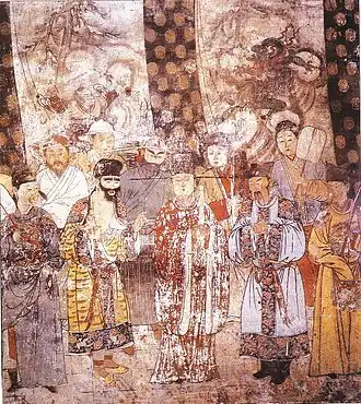 During the Han dynasty (206 BC–220 AD), a wrestling show called Horn-Butting Show (Chinese: 角觝戲; pinyin: Jiǎodǐxì) flourished and became one of the so-called "Hundred Shows" (百戲) under Emperor Wu (reigned 141–87 BC). While most probably this was also a spectator sport, both textual and archaeological evidence suggests that performers were dressed in fixed roles and performed according to a plot. One such story the wrestlers re-enacted was the battle between a tiger and a magician named "Lord Huang from the East Sea" (東海黃公).[10] Han-period murals discovered from an aristocratic tomb in Dahuting, Xinmi, Henan, offer strong proof that entertainers performed at banquets in the homes of higher-ranking ministers during this period.[11]