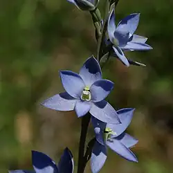 Thelymitra media, commonly known as tall sun orchid,[2] is a species of orchid that is endemic to eastern Australia. It has a single fleshy, channelled leaf and up to thirty blue flowers with darker streaks but without spots. The labellum (the lowest petal) is narrower than the other petals and sepals.
