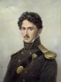 The libretto was written by Louise Otto-Peters, who had already shown ardent interest in patriotic subjects as a youth.[1] It depicts the last episode of Theodor Körner's life from the beginning of his military engagement until his death. Körner, a famous German poet during the Wars of Liberation against Napoleonic hegemony, was free of personal worries due to his professional success culminating in the appointment as k. k. Hoftheaterdichter,[2] a playwright of the imperial court at the Burgtheater in Vienna. He nonetheless voluntarily joined the famous Lützow Free Corps as he wanted to deliver Germany from French dominance, writing to his father: "Yes, my dearest father, I want to become a soldier. I want to give up the newly acquired happy and carefree live joyously in order to fight for my fatherland, even if I have to spill my blood. […] No one is too valuable for the death for the liberty and the honour of his nation, but many are not valuable enough."[3][4] In 19th-century Germany, Körner hence became a national hero.[5]