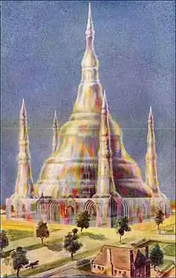 Alfred Edward Warner (1879–1968) had in Sydney his own commercial art studio. In 1923, he became a member of the Australian Painter-Etcher's Society and was in its Council at 1923–1925. In 1923, he was also one of the founders of the Australian Ex Libris Society.[189] For several years Warner successfully collaborated with Leadbeater, illustrating his books, in particular, The Science of the Sacraments.[190] On his illustration The Completed Eucharistic Form "the thought-form takes a mosque-like appearance with minarets rising from the church to envelop and influence the surrounding countryside."[191] In preface to his Chakras, Leadbeter wrote that the "fine series of drawings" to the book was made by Edward Warner.[192]