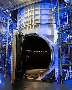 A thermal vacuum test chamber, with its door open, at NASA's Johnson Space Center.