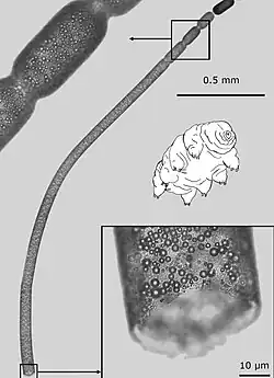Light microscopy montage of the upper half of a Ca. T. magnifica cell, with a broken basal part revealing a tube-like morphology due to the large central vacuole and numerous spherical intracellular sulfur granules (a tardigrade is shown for scale)