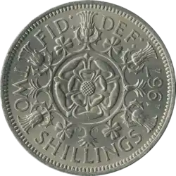 As the floral emblem of Scotland it appears in the Royal Arms of the United Kingdom thereafter, and was included in the heraldry of various British institutions, such as the Badge of the Supreme Court of the United Kingdom alongside the Tudor rose, Northern Irish flax, and Welsh leek. This floral combination appears on the present issues of the one pound coin. Beside the Tudor rose and Irish shamrock the thistle appears on the badge of the Yeomen of the Guard and the arms of the Canada Company. Issues of the historical florin showed the same flora, later including a leek.