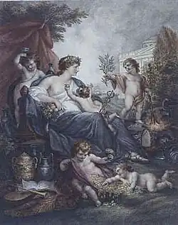 Most of Burke's mezzotints were engraved after Angelica Kauffman for William Wynne Ryland, who taught him the stipple engraving technique.[4] After 1775, Burke worked primarily by engraving in stipple, giving his work depth and richness.[1] Burke preferred to work for publishers and seldom issued prints himself. His engravings typically featured subject pictures.[4] The first engraving he did after Kauffman was Queen Charlotte Raising the Genius of the Fine Arts (1772). From 1775 to 1779, Burke did not sign his plates, starting to sign again with engravings for Ryland in 1779 and producing work for other publishers from 1782.[3]