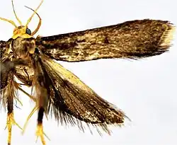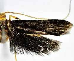 Meyrick described Thubana xanthoteles on the basis of two female specimens and described Thubana melitopyga from one female specimen. John Frederick Gates Clarke regarded Thubana melitopyga as a junior synonym of Thubana xanthoteles. Kyu-Tek Park described Thubana stenosis on the basis of specimens collected from north Thailand, which bears a "golden yellow bandlike costal patch" on the forewing. He also noticed that the female genitalia of Thubana stenosis are hardly distinguishable from those of Thubana xanthoteles. Later study concluded that the male genitalia of the three specimens collected in south Yunnan undoubtedly match with those of Thubana stenosis described by Park, and the female genitalia match with those of Thubana stenosis and of Thubana xanthoteles.[1]