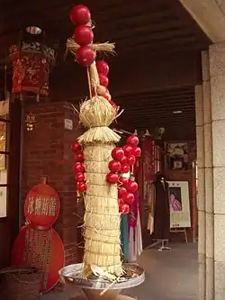 Tanghulu 糖葫蘆 糖葫芦 táng húlu It is customary in Tianjin to eat Tanghulu on the eve of the Lunar New Year. The most popular tanghulu is made of hawthorn berries. Hawthorn berries have their seeds removed and are skewered on a thin bamboo stick, then dipped in hot syrup. When they turn cool, the stringed berries wrapped in crystallized sugar look like beautiful stone beans pungently sweet and sour. Sometimes, the hollowed hawthorn berries are filled with red bean paste, walnut and melon seeds. Today, in addition to hawthorn, a wide variety of tanghulu has been developed, including water chestnut, tangerine, apple, pear and crab-apple, etc.