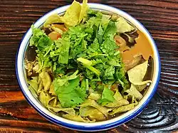 Tianjin cuisine (Tientsin cuisine), also known as Jin cuisine,[1] refers to the native cooking styles of Tianjin, the largest port city in Northern China. Though heavily influenced by Beijing cuisine, Tianjin cuisine differs by being more focused on seafood. It is categorized by its freshness, saltiness and soft and crispy textures. Cooking methods include grilling, simmering, sautéing and steaming. With more than 300 years of history, the development of the Tianjin cuisine was highly dependent on the diet of boatmen and the salt trades due to its geographical location. Tianjin Food Street is a place where cross-cultural Chinese dishes may be found. Popular dishes include Eight Great Bowls, Four Great Stews, Tianjing goubuli, and Four Winter Delicacies, among others.[2] Eight Great Bowls is a combination of eight different meat dishes. The Four Great Stews refers to a very large number of stews, including chicken, duck, seafood, beef, and mutton. Tianjin also has several famous snack items. Goubuli (狗不理包子) is a classic steamed stuffed bun (baozi) that is well-known throughout China. Guifaxiang (桂发祥麻花) is a traditional brand of mahua (twisted dough sticks).