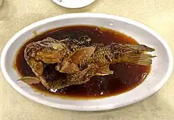 Zeng beng carp, or sweet and sour carp, is made with deep-fried carp with scales. It is named because the shape of the fish in the dish looks lively like struggling and jumping in a Zeng net (罾网).[14] The carp is first marinated with a series of blended seasoning, then it’s placed in a Zeng, a type of bamboo basket designated for fishing, and immerse the Zeng in a wok full of steaming-hot oil, making the carp in the shape of Beng (leap and sizzle), and finally, the fish is served with heated sweet and sour sauce.[15] It is characterized by its crispy fish bones, tender meat, and the great signature taste of sweet and sour. Especially when the sauce is poured during the serving, the aroma is overflowing.[16] Traditionally, the sweet and sour sauce for Zeng beng carp is a joint of the various ingredients in Tianjin: Laochou (老抽, aged soy sauce), ginger, garlic, red and green pepper, Duliu vintage vinegar, Prickly Ash Oil (Sichuan Peppercorn Oil), etc.[15] As the hot fish absorbs the hot juice, the "squeaking" sound after the deep-fry is endless. The Se (Look), Xiang (Fragrance), and Wei (Taste) all combined to make the dish of Zeng beng carp especially interesting to eat.