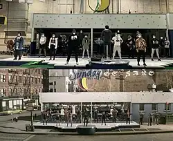 For "Sunday," which parodies the Act 1 finale of the same name from Sondheim's Sunday in the Park with George, the team set up the sequence as a deliberate contrast to the look of the rest of the film, as it is Larson's "wildest dream." This included the idea to turn the Moondance Diner into a proscenium stage by having the front come down, and overexposing the footage to resemble a painting, especially with the transition to a pointillist look at the very end of the song.[43] The song had only ever been performed by Larson himself during his lifetime, so Miranda wanted to depict Larson's "dream choir" for the pivotal sequence.[55] This included the actors who inspired him, particularly Peters for her role in Sunday in the Park with George, but also his future collaborators in Pascal, Rubin-Vega, and Heredia, as well as cast members from shows that Miranda considers "direct descendants" of Larson's work: Malone appears dressed as Big Alison from Fun Home, while Goldsberry and Soo wear the colors and strike the pose of the Schuyler sisters from Miranda's own Hamilton.[52] Miranda also recruited Michael Starobin, who orchestrated Sunday in the Park with George, to achieve the sound of the Sondheim parody.[56] The scene was shot under heavy COVID protocols, particularly for some of the older actors. Miranda's cameo in the scene was written for Chip Zien and Joanna Gleason, who starred in the original Broadway cast of Sondheim's Into the Woods, but COVID restrictions prevented them from appearing.[55]