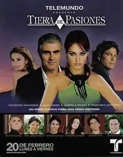 Tierra de pasiones (Land of Passions) is a Spanish-language telenovela produced by Telemundo which is owned by NBC Universal. Tierra de Pasiones was filmed on a set in Homestead, Florida, and aired weekdays from February 20, 2006 to October 24, 2006 at 8 pm ET.