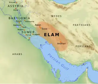 Map showing the area of the Elamite kingdom and the neighbouring areas. The approximate Bronze Age extension of the Persian Gulf is shown.