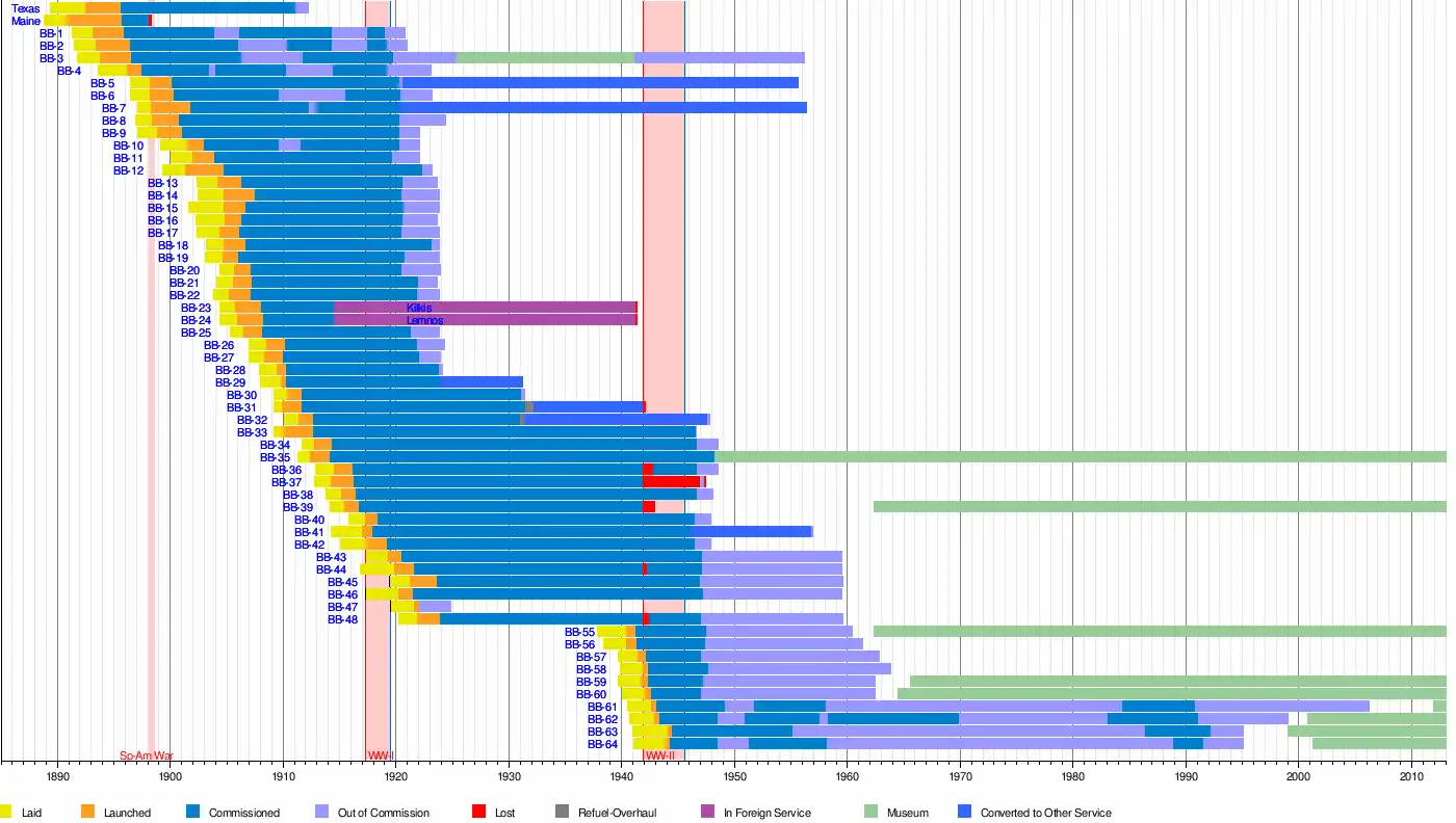 This is a bar graph showing a Timeline of battleships of the United States Navy. The ships are listed in order of hull number.