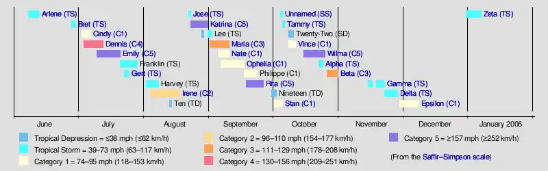 Tropical Storm Zeta (2005)Hurricane Epsilon (2005)Tropical Storm Delta (2005)Tropical Storm Gamma (2005)Hurricane BetaTropical Storm Alpha (2005)Hurricane WilmaHurricane Vince (2005)Tropical Storm Tammy (2005)2005 Azores subtropical stormHurricane StanHurricane RitaHurricane Ophelia (2005)Hurricane Nate (2005)Hurricane Maria (2005)Hurricane KatrinaTropical Storm Jose (2005)Hurricane Irene (2005)Tropical Storm Gert (2005)Hurricane Emily (2005)Hurricane DennisHurricane Cindy (2005)Tropical Storm Bret (2005)Tropical Storm Arlene (2005)Saffir–Simpson scale