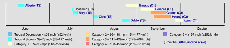 Hurricane Isaac (2006)Hurricane Helene (2006)Hurricane Gordon (2006)Hurricane Florence (2006)Hurricane Ernesto (2006)Tropical Storm Debby (2006)Tropical Storm Chris (2006)Tropical Storm Beryl (2006)Tropical Storm Alberto (2006)Saffir-Simpson scale