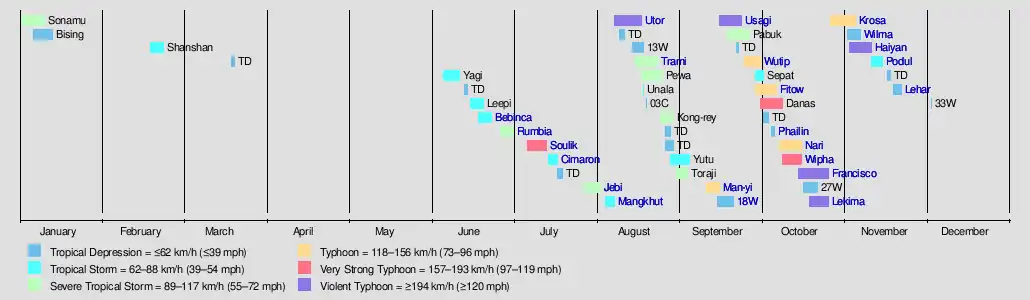 Cyclone LeharTropical Storm Podul (2013)Typhoon HaiyanTropical Depression Wilma (2013)Typhoon Krosa (2013)Typhoon Lekima (2013)Typhoon Francisco (2013)Typhoon Wipha (2013)Typhoon Nari (2013)Cyclone PhailinTyphoon FitowTyphoon Wutip (2013)Typhoon Usagi (2013)Tropical Depression 18W (2013)Typhoon Man-yi (2013)Tropical Storm Trami (2013)Typhoon UtorTropical Storm Mangkhut (2013)Tropical Storm Jebi (2013)Tropical Storm Cimaron (2013)Typhoon Soulik (2013)Tropical Storm Rumbia (2013)Tropical Storm Bebinca (2013)