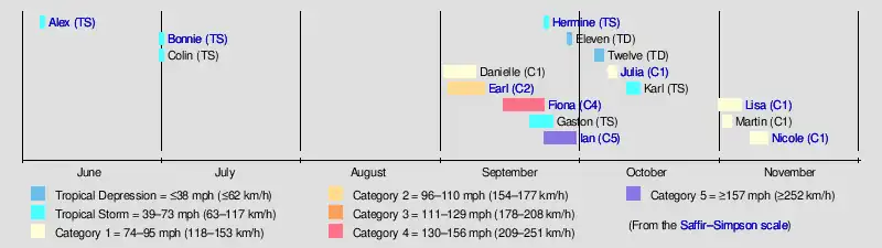 Hurricane Nicole (2022)Hurricane Lisa (2022)Hurricane Julia (2022)Tropical Storm Hermine (2022)Hurricane IanHurricane FionaHurricane Earl (2022)Hurricane Bonnie (2022)Tropical Storm Alex (2022)Saffir–Simpson scale