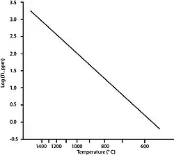Plot of Ti abundance (log of Ti ppm) versus Temperature in Celsius. Simplified version, modified from Watson and Harrison 2005.