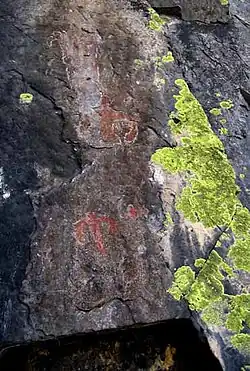 On the slopes of Titovskaya Sopka four sites with ancient rock paintings are known. The first two were discovered in the 1950s by A. P. Okladnikov, they are Titovskaya Sopka and Sokhatiny Kamen.[6] Other monuments with ancient art are Sukhotino 13[7] and Gorge,[8] burials from the Bronze Age to the Middle Ages are also known. Gold and silver objects were found in some of the burials. On the south-western slope of the mountain the Russian settlement Zasoposhnoye, inhabited in the late XVII - 1st half of the XIX century, was studied. According to P. S. Pallas, the inhabitants of the settlement built rafts for rafting on the Ingoda, Shilka and Amur rivers. There are remains of log houses, blacksmith's and potter's workshops in the settlement. Later, due to the erosion of the slopes, the settlement was moved to the neighboring Zasopka village.