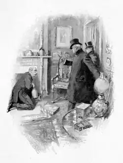 However, Lord Ernest suddenly returns home. Raffles, feigning to be a Scotland Yard detective, pretends to arrest Lord Ernest. Raffles then passes his bared revolver to Bunny, and leaves on the pretense of calling a cab. When they are alone, Lord Ernest overpowers Bunny, and knocks him out.