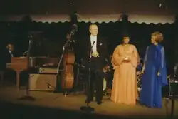 In 1962, Flanagan was asked by jazz impresario Norman Granz to become Ella Fitzgerald's full-time accompanist.[23] Flanagan was looking for steadier work than was available with Hawkins, so he accepted.[23] He worked with Fitzgerald from 1962 to 1965.[15][24] They toured internationally, including to Japan in 1964.[25] He also played with other bands when not required by the vocalist; these included a brief reunion with Rollins in 1965.[26] Later the same year, Flanagan left Fitzgerald and was part of Art Farmer's short-lived New York Jazz Sextet, which recorded Group Therapy.[27][28] Flanagan then became accompanist to Tony Bennett for part of 1966,[29] and lived on the West Coast.[24]