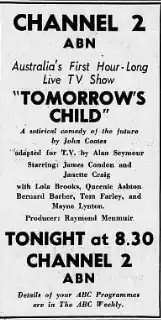 Tomorrow's Child is an Australian television film, or rather a live one-off television play, which aired in 1957 on ABC. Directed by Raymond Menmuir, it is notable as an early example of Australian television comedy and was Australia's first live hour long drama.[3][4][5][6] It was set in the future, making it technically Australia's first science fiction drama.[7]